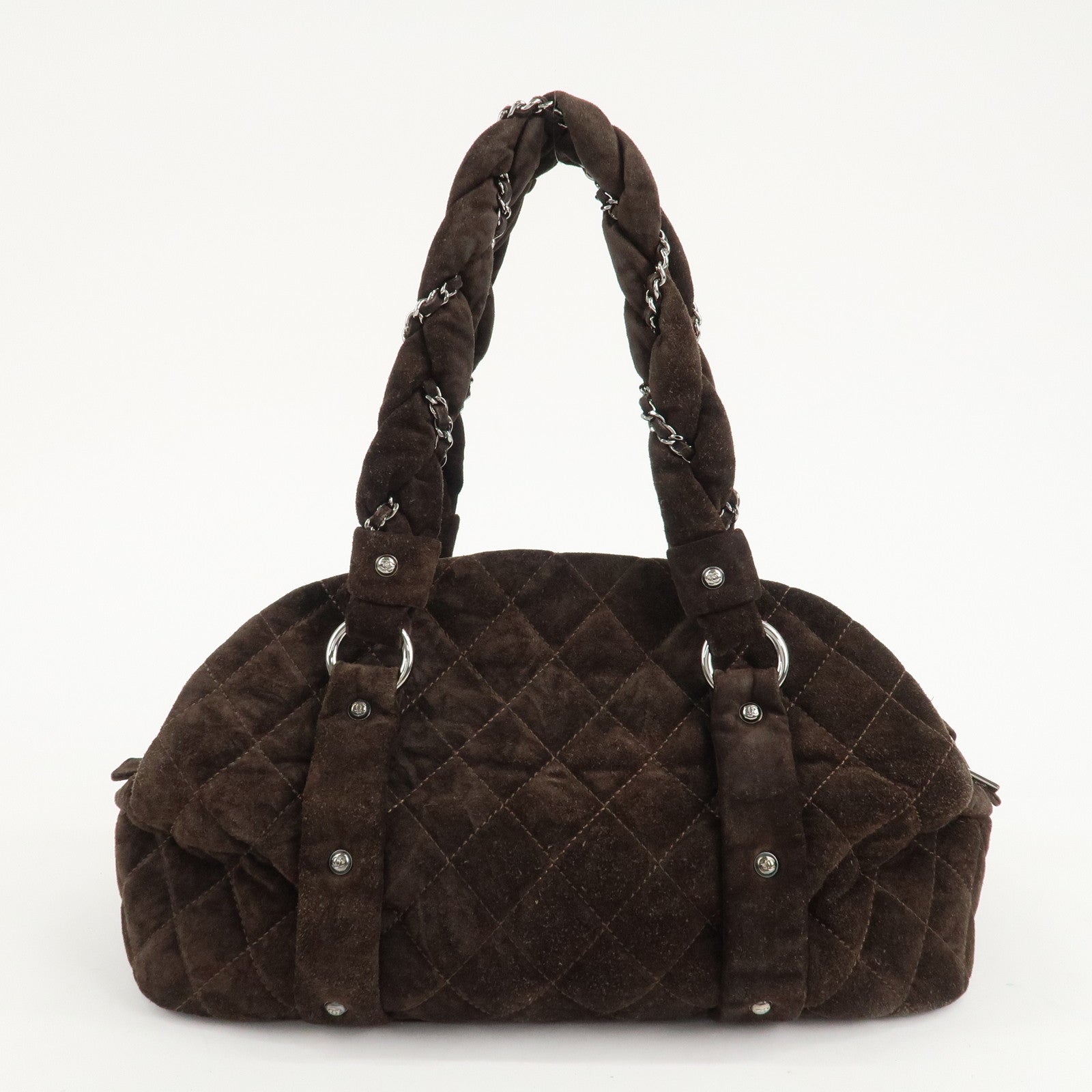 CHANEL Matelasse Suede Boston Bag Brown Silver Hardware Used