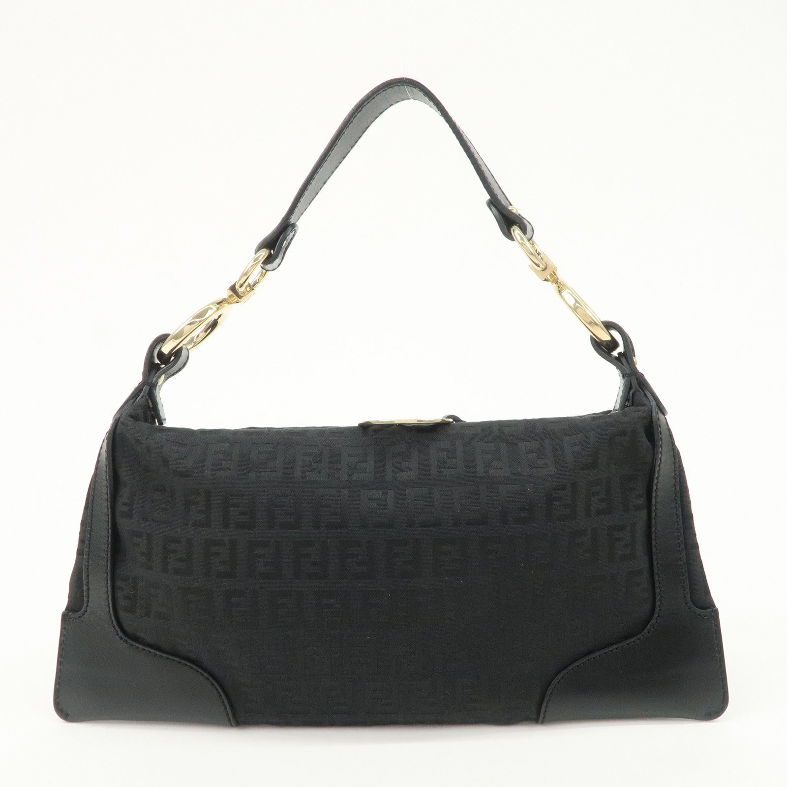FENDI Zucchino Canvas Leather Logo Charm Shoulder Bag Black 8BR464