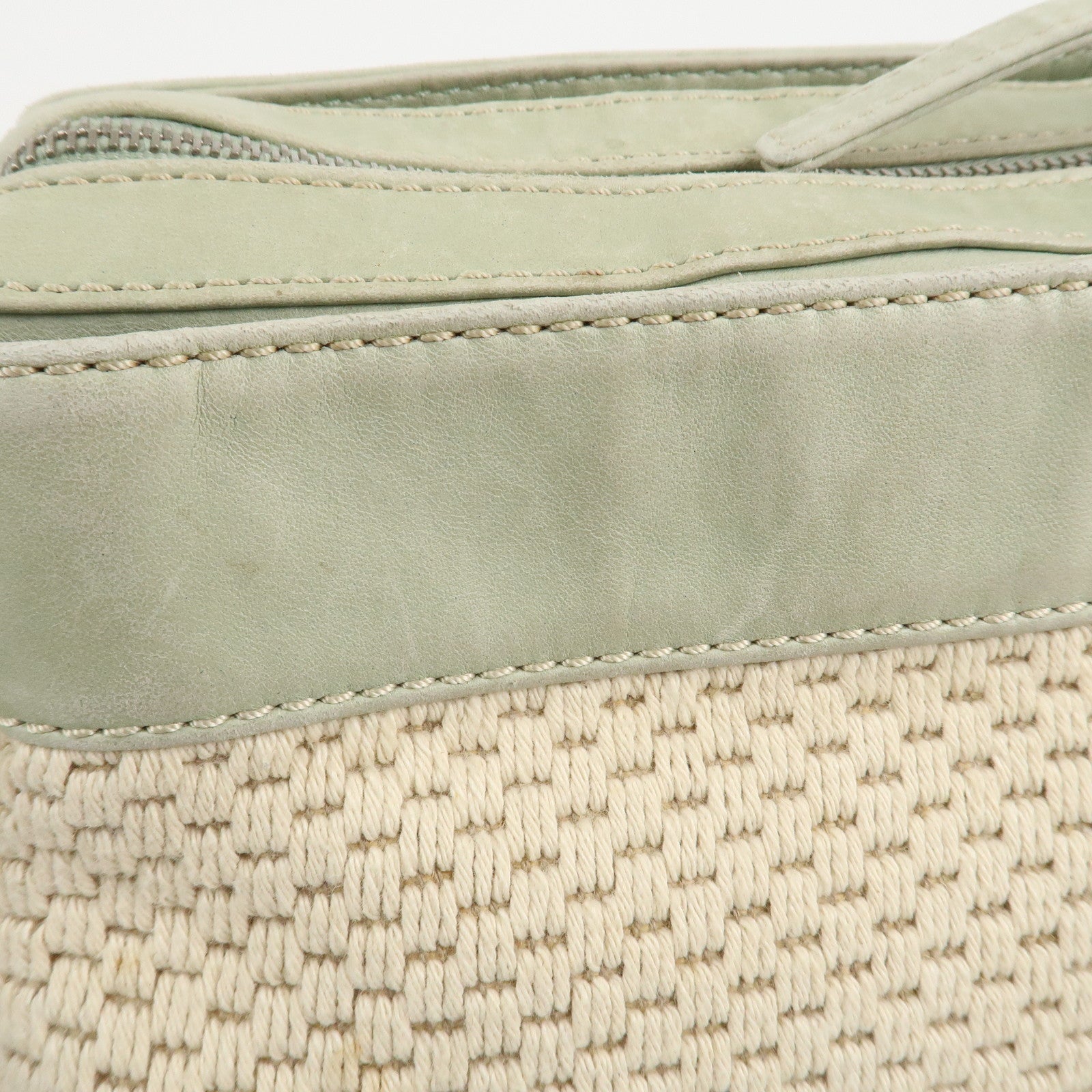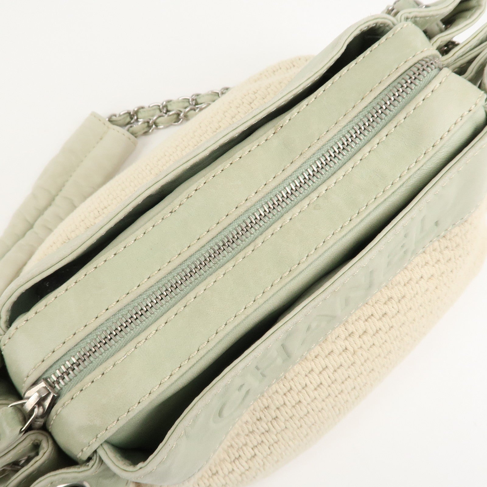 CHANEL Cotton Leather Chain Shoulder Bag Ivory Light Green Used